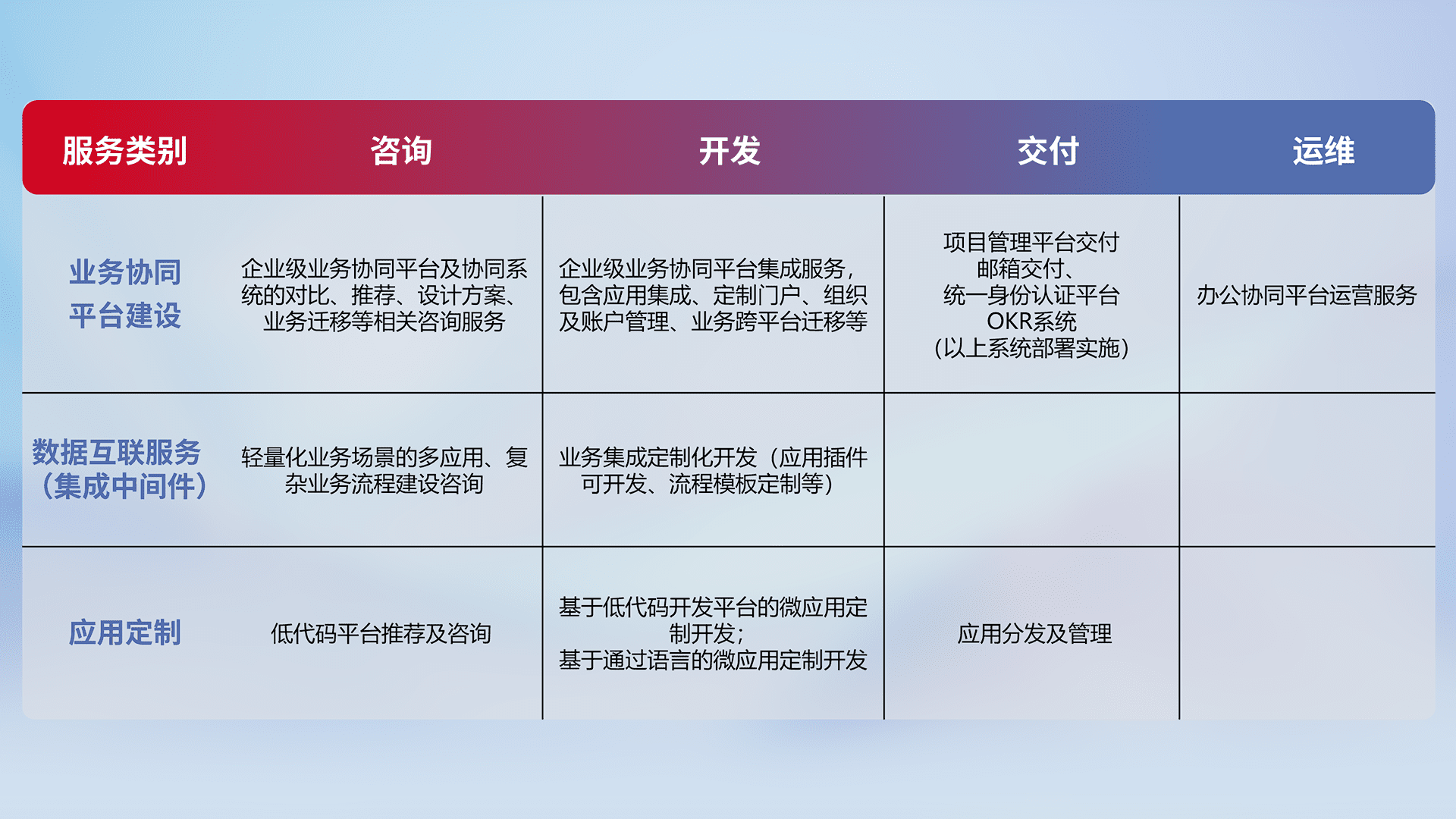 针对钉钉、、、企微、、、、IDaas等平台级产品提供产品的规划、、、方案、、、交付、、定制化开发等服务,,,实现如统一协同办公、、、、智能客户服务、、、混合会议管理、、、智能数据查询、、等业务场景,,实现数字化转型。。。